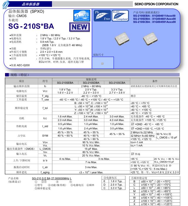 根據市場的需求,愛普生公司用心專研當下的需求,針對性發布編碼X1G004611A003,石英晶體振蕩器,型號SG-210SEBA,尺寸為2520mm,頻率為27MHZ,電壓1.6~2.2V,輸出CMOS,頻率穩定度10ppm,工作溫度-40to125°C,具備良好的耐壓性能和高可靠性能,非常適合用于汽車胎壓監測,羅拉模塊,通信模塊,儀器設備,無線藍牙,智能家居等領域.