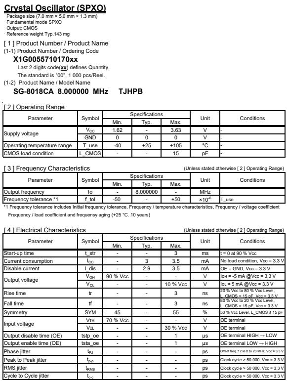 X1G005571017000 | SG-8018CA | 8.000000 MHz | 7.00 x 5.00 x 1.40 mm | CMOS | 1.620 to 3.630 V | -40 to 105 °C |