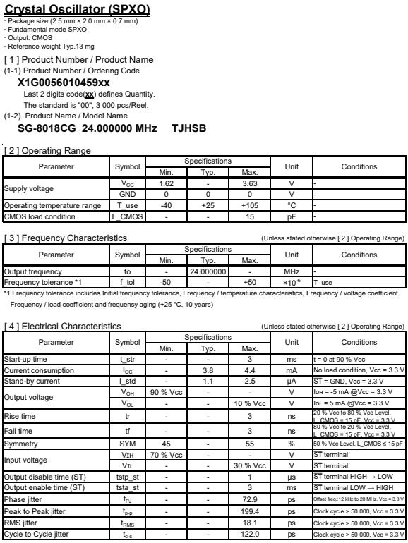 X1G005601045900 | SG-8018CG | 24.000000 MHz | 2.50 x 2.00 x 0.80 mm | CMOS | 1.620 to 3.630 V | -40 to 105 °C | +/-50 ppm |