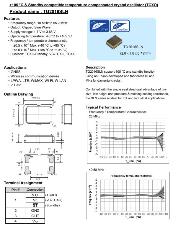 X1G005731060116 | TG2016SLN | 26.000000 MHz | 2.00 x 1.60 x 0.61 mm | 3.135 to 3.465 V | +/-2.0 ppm | -40 to ++85 °C | +/-0.50 ppm |