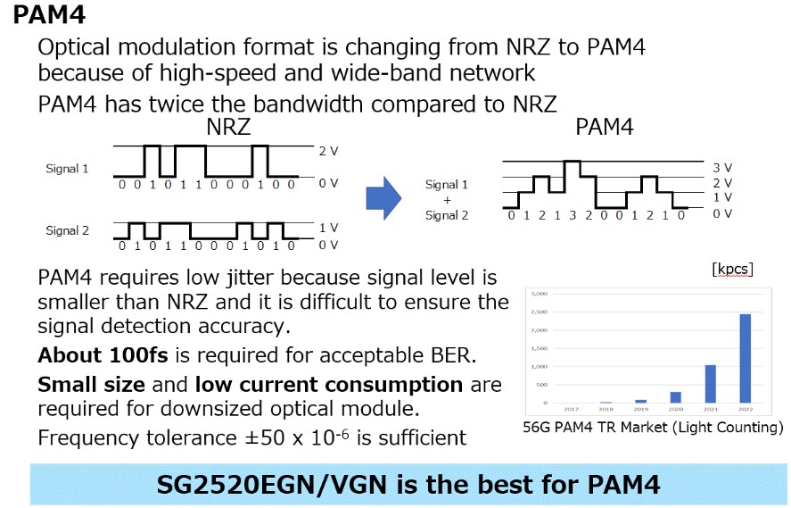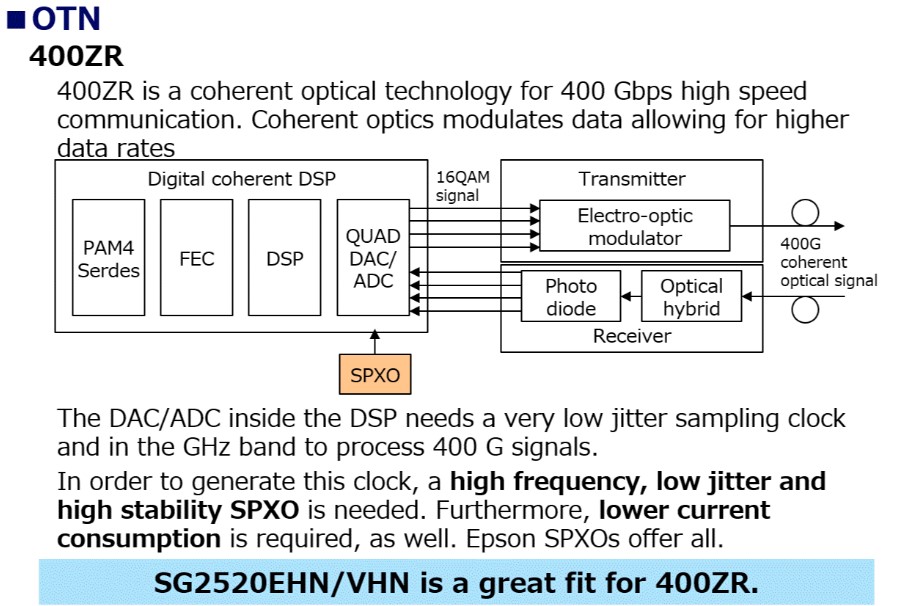 由于物聯(lián)網(wǎng)和ADAS等5G應用的實施,隨著數(shù)據(jù)流量的增長,網(wǎng)絡基礎設施變得比以往任何時候都更加重要。IT廠商一直在快速建設數(shù)據(jù)中心,對安裝在數(shù)據(jù)中心內(nèi)部的光模塊有著巨大的需求。這種應用要求晶體振蕩器具有“小”、“低抖動”和“高穩(wěn)定性”,而我們的SG2520系列貼片石英晶振可以滿足所有這些要求。以下是我們產(chǎn)品的特點,這些將有助于光模塊的性能。X1G0058810001專用于6G光學應用的小型封裝高穩(wěn)定性振蕩器
