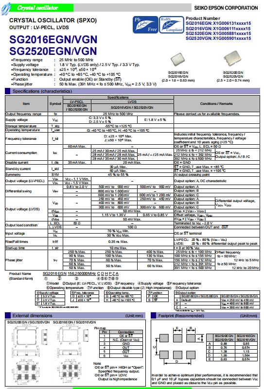 X1G005901000415 | SG2520VGN | 156.250000 MHz | 2.50 x 2.00 x 0.84 mm | LVDS | 3.135 to 3.465 V | -40 to 105 °C | +/-50 ppm |