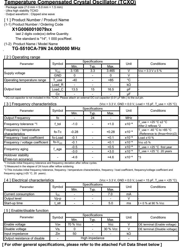 X1G006001007914 | TG-5510CA | 24.000000 MHz | 7.00 x 5.00 x 1.50 mm | Clipped sine wave | 3.135 to 3.465 V | +/-1.0 ppm | -40 to +85 °C |