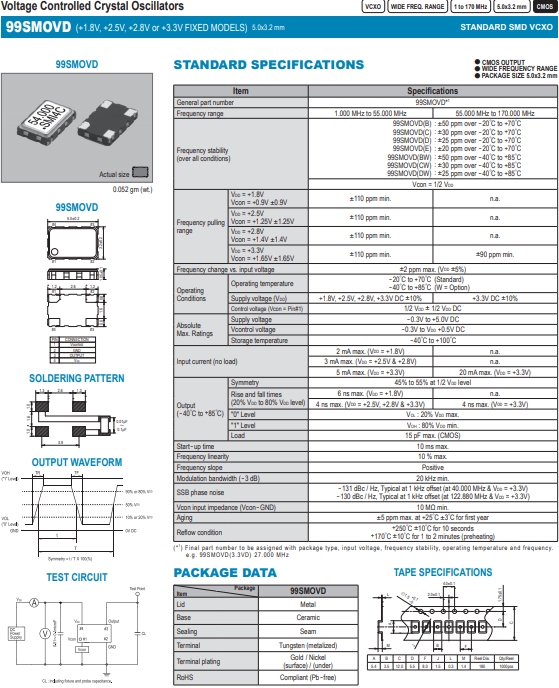 SMI晶體,石英晶體振蕩器,99SMOVD晶振.有源貼片石英晶振外觀使用金屬材料封裝的,具有高穩定性,高可靠性的石英晶體諧振器,晶振外觀本身使用金屬封裝,充分的密封性能,可確保其高可靠性,采用編帶包裝,外包裝采用朔膠盤,可在自動貼片機上對應自動貼裝等優勢.