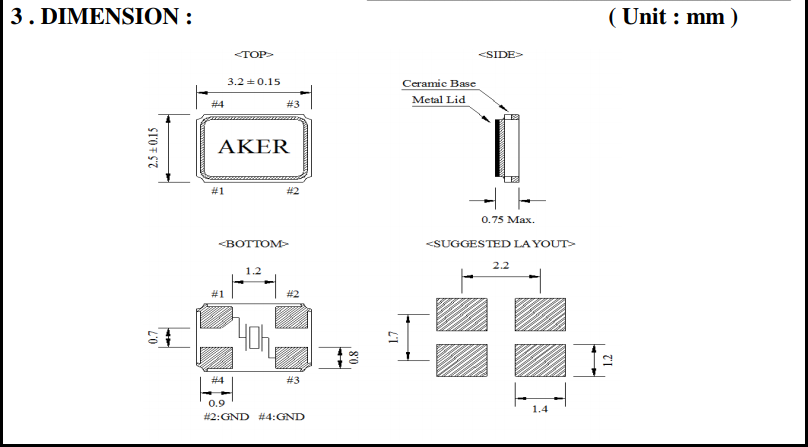 封裝 | 金屬面貼片 | 尺寸 | 3.2*2.5*0.75mm |