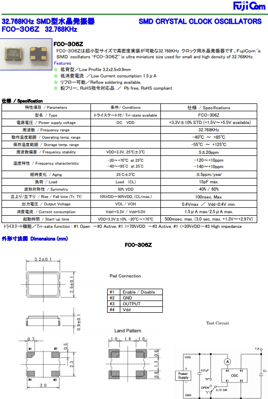 富士晶振,32.768KHz,FCO-306Z壓電石英晶振.小型,薄型,質(zhì)地輕的表面貼片音叉型晶體振蕩器,手機(jī)晶體,產(chǎn)品體積小,特別適用于各種小巧的便攜式消費(fèi)電子數(shù)碼產(chǎn)品,在移動(dòng)通信領(lǐng)域廣泛的應(yīng)用,晶振產(chǎn)品本身可發(fā)揮優(yōu)良的電氣特性,滿足無鉛焊盤的高溫回流溫度曲線要求.