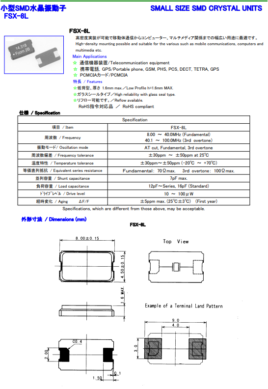 富士晶振 | 單位 | FSX-8L晶振 | 石英晶振基本條件 |