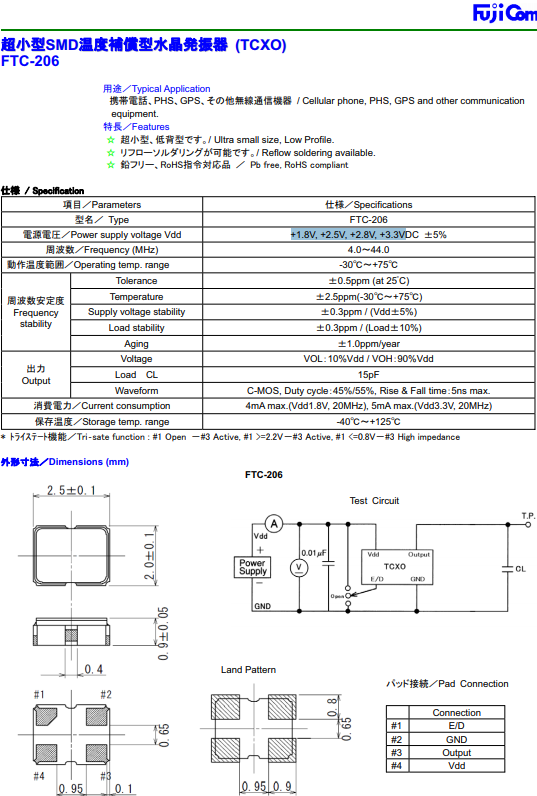 富士晶振,溫補振蕩器,FTC-206振蕩子.溫補晶振(TCXO)產(chǎn)品本身具有溫度補償作用,高低溫度穩(wěn)定性:頻率精度高0.5PPM~2.0PPM,常用頻率:26M,33.6M,38.4M,40M.因產(chǎn)品性能穩(wěn)定,精度高等優(yōu)勢,被廣泛應(yīng)用到一些比較品質(zhì)的數(shù)碼通訊產(chǎn)品領(lǐng)域,導(dǎo)航定位系統(tǒng),智能手機,WiMAX和無線通信等產(chǎn)品,符合RoHS/無鉛.