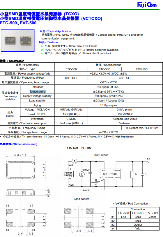 富士晶振,TCXO振蕩器,FTC-506石英晶振.溫補晶振(TCXO)產(chǎn)品本身具有溫度補償作用,高低溫度穩(wěn)定性:頻率精度高0.5PPM~2.0PPM,常用頻率:26M,33.6M,38.4M,40M.因產(chǎn)品性能穩(wěn)定,精度高等優(yōu)勢,被廣泛應用到一些比較品質(zhì)的數(shù)碼通訊產(chǎn)品領(lǐng)域,導航定位系統(tǒng),智能手機,WiMAX和無線通信等產(chǎn)品,符合RoHS/無鉛.