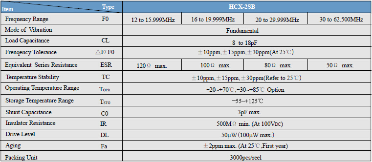 鴻星晶體諧振器HCX-2SB2520,HCX-1AB2016,HCX-TAB1612石英晶振,非常緊湊輕薄(2.5 * 2.0 * 0.65mm MAX)頻率范圍12M至62.5M.應(yīng)用于手機和藍(lán)牙程序中.良好的耐熱性和耐沖擊性.無鉛的產(chǎn)品.這些能滿足使用無鉛焊料回流分析的要求.