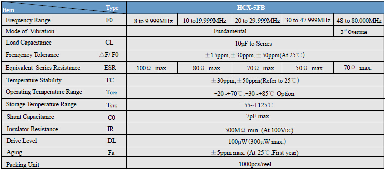 HCX-5FA二腳陶瓷面諧振器,5032mm智能手機晶振,臺灣鴻星晶振,是一個超微型包時鐘振蕩器尺寸為5.0 * 3.2 * 1.4mm.工作頻率8.0~80.0MHZ,頻率可以滿足大多數(shù)藍牙芯片,優(yōu)良的電氣性能最優(yōu)為手機和藍牙應用程序展示,良好的耐熱性和耐沖擊性,無鉛的產(chǎn)品,這些能滿足使用無鉛焊料回流分析的要求.