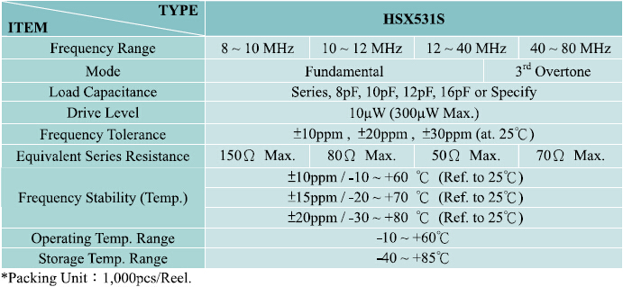HELE加高貼片晶振,HSX531S晶體諧振器,計算機晶振,封裝大小5.0*3.2*0.75mm,頻率范圍8.00 to 80.0MHZ,工作溫度-10~+60℃耐高溫環境,精度高和良好的耐熱性和可靠性,適合各種應用程序,理想解決方案網絡設計不太敏感的空間約束和采購策略想尋找一個更主流的行業包的大小.