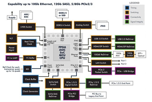 嵌入式應(yīng)用所使用的處理器包含了從主要CPU、SOC和FPGA供貨商提供的的CPU芯片組,這些芯片組在各個主要的市場區(qū)間都有被使用.在Pericom提供的的FPGA應(yīng)用方塊圖中舉例說明了Pericom可以提供的許多I/O、電力管理和計時功能.
