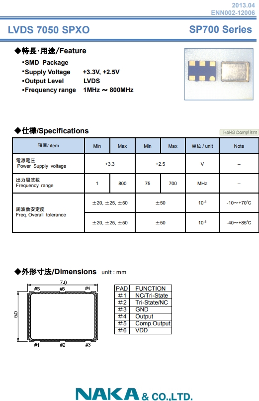 NAKA晶體,SPXO振蕩器,SP700晶體振蕩器.小型貼片有源晶振,體積的變小也使產(chǎn)品帶來(lái)了更高的穩(wěn)定性能,接縫密封日本NAKA晶振,精度高,覆蓋頻率范圍寬的特點(diǎn),貼片高速自動(dòng)安裝和高溫回流焊設(shè)計(jì),Optionable待機(jī)輸出三態(tài)輸出功能,電源電壓范圍:1.8V~5V,高穩(wěn)定性,低抖動(dòng),低功耗.