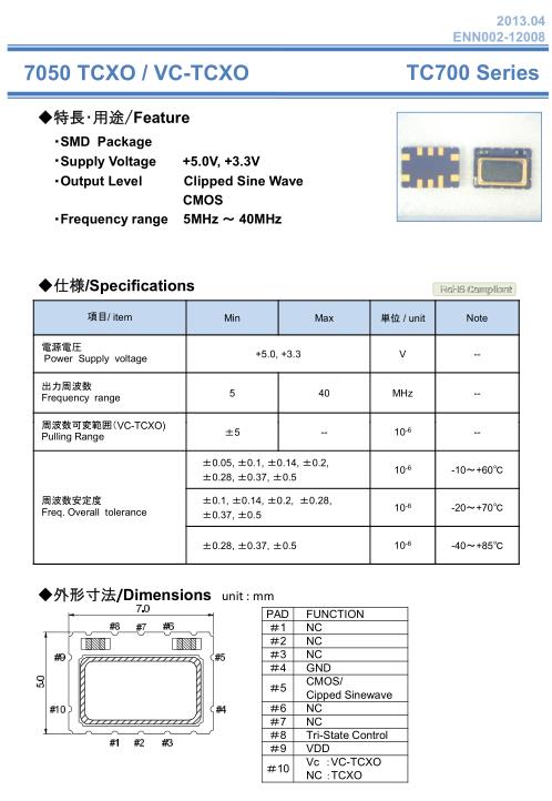NAKA晶振,VC-TCXO晶振,TC700進(jìn)口晶振.壓控溫補(bǔ)晶振具有適合于移動通信設(shè)備用途的高穩(wěn)定的頻率溫度特性.為對應(yīng)低電源電壓的產(chǎn)品.(可對應(yīng)DC+1.8V±0.1V to+3.2V±0.1V )高度:高1.0 mm,體積:0.007 cm3,重量:0.024g,小型,輕型.低消耗電流,表面貼片型產(chǎn)品.(可對應(yīng)回流焊)無鉛產(chǎn)品.滿足無鉛焊接的回流溫度曲線要求.