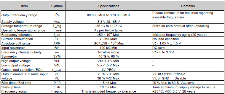 VG-4511CA,KGCT,JGCT,GGCT振蕩器,六腳貼片晶振,愛普生有源晶振,頻率范圍80MHz~170MHz,電源電壓3.3V,絕對頻率控制范圍50×10-6, 100×10-6,功能使能(OE),外部尺寸規格7.0×5.0×1.6mm,輸出LV-PECL.編帶包裝方式,可對應自動高速貼片機自動焊接,及IR回流焊接(無鉛對應),為無鉛產品,超小型,質地輕.產品被廣泛應用到集成電路,程控交換系統,無線發射基站.