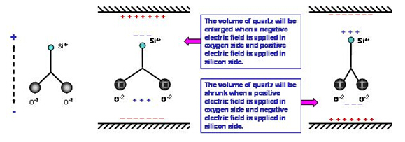 石英材料中的二氧化硅分子(SiO2) 在正常狀態(tài)下, “FC-135 32.7680KA-K3”其電偶極是互相平衡的電中性. 在(圖二左)的二氧化硅是以二維空間的簡化圖形. 當(dāng)我們在硅原子上方及氧原子下方分別給予正電場及負(fù)電場時, 空間系統(tǒng)為了維持電位平衡, 兩個氧原子會相互排斥, 在氧原子下方形成一個感應(yīng)正電場區(qū)域, 同時在硅原子上方產(chǎn)生感應(yīng)負(fù)電場區(qū)域. 相反的情況, 當(dāng)我們在硅原子上方及氧原子下方分別給予負(fù)電場及正電場時, 兩個氧原子會相互靠近, 氧原子下方產(chǎn)生感應(yīng)負(fù)電場,硅原子上方產(chǎn)生感應(yīng)正電場. (圖二). 然而, 氧原子的水平位置變化時, 鄰近的另一個氧原子會相對的產(chǎn)生排斥或吸引的力量, 迫使氧原子回到原來的空間位置. 因此, 電場的力量與原子之間的力量會相互牽動, 電場的改變與水平方向的形變是形成交互作用狀態(tài). 這個交互作用會形成一個在石英材料耗能最小的振動狀態(tài), 祇要由電場持續(xù)給與能量, 石英材料就會與電場之間維持一個共振的頻率. 這個壓電效應(yīng)下氧原子的振幅與電場強度及電場對二氧化硅的向量角度有相對應(yīng)的關(guān)系.在實際的應(yīng)用上, 電場是由鍍在石英芯片上的金屬電極產(chǎn)生, 電場與二氧化硅的向量角度則是由石英晶棒的切割角度來決定.