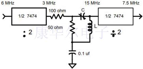 該合成器使用單個7474觸發(fā)器將6MHz輸入轉(zhuǎn)換為7.5MHz(倍數(shù)為1.25).來自石英振蕩器的6MHz方波被觸發(fā)器之一分頻,并施加到類似于圖2的網(wǎng)絡(luò)上.1.將3MHz(15MHz)的五次諧波除以第二觸發(fā)器產(chǎn)生7.5MHz.